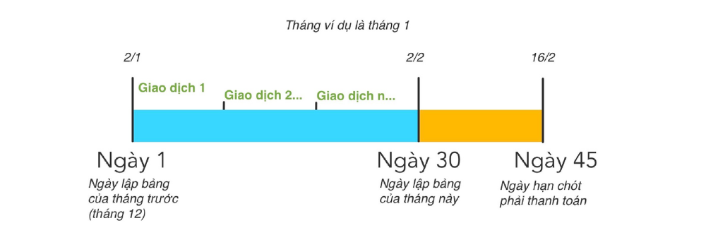 - Chu kỳ thanh toán: Là khoảng thời gian giữa hai lần sao kê của ngân hàng, thường là 30 ngày.