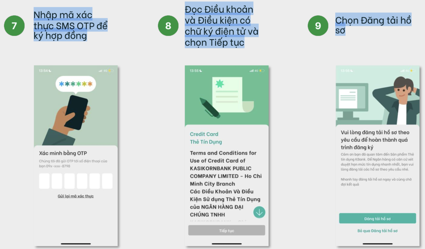 Khách hàng đã hoàn tất đăng ký mở tài khoản qua ứng dụng K PLUS Vietnam và đăng ký Thẻ Tín dụng theo các bước sau: Nhập mã xác thực SMS OTP để ký hợp đồng. Đọc Điều khoản và Điều kiện có chữ ký điện tử và chọn Tiếp tục.