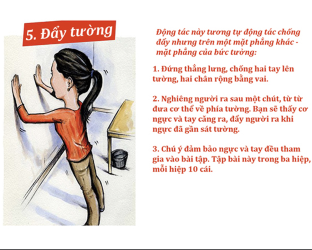 - Đứng thẳng, hai chân rộng bằng vai, căng vai và đặt hai bàn tay chống lên tường với độ cao bằng vai.