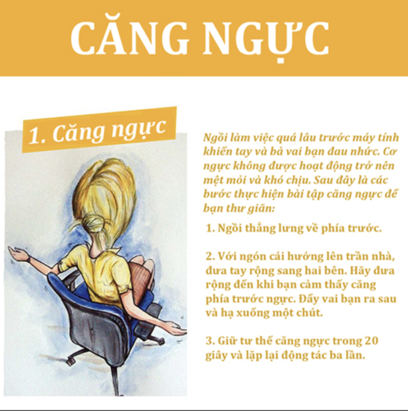 Gõ bàn phím nhiều dễ gây mỏi từ cánh tay tới bả vai và tư thế khom lưng. Bài tập căng ngực giúp giảm mệt mỏi cho cơ ngực và bả vai:
