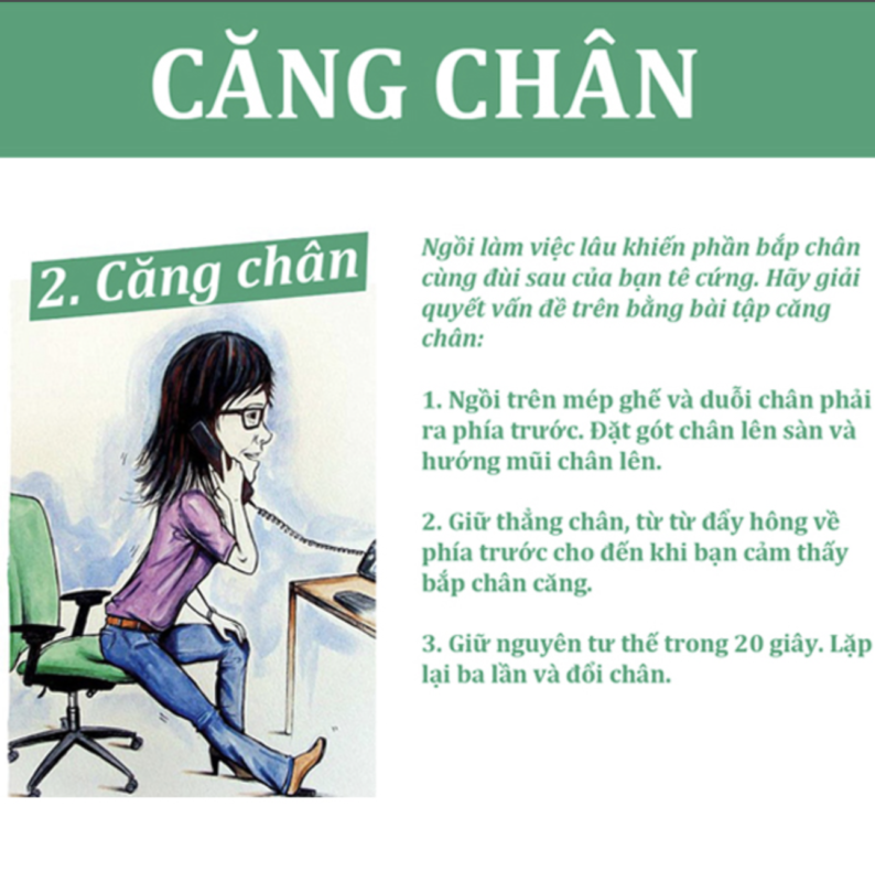 Ngồi quá lâu có thể làm các cơ chân bị co rút và mỏi. Bài tập sau giúp giảm tình trạng này: