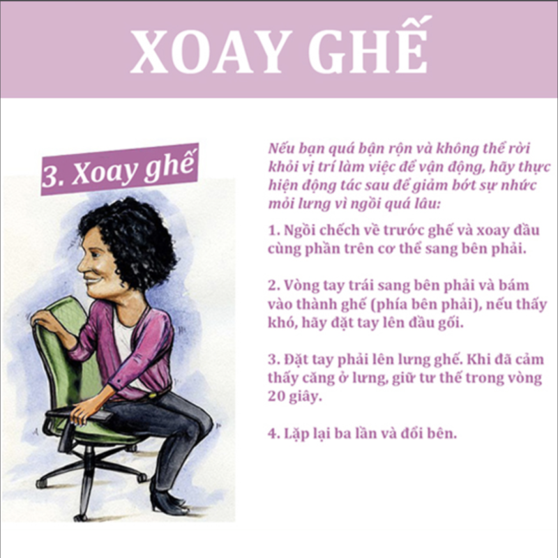 Động tác xoay ghế giúp linh hoạt cột sống và giảm căng cứng ở lưng: