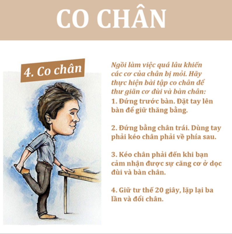 - Đứng trước bàn làm việc và nâng gót chân phải lên sát mông.