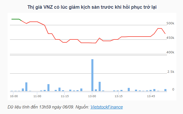 Diễn biến tiêu cực bắt đầu từ khoảng 11h trưa, khi cổ phiếu VNZ giảm sâu và có thời điểm rớt xuống mức 437.800 đồng/cổ phiếu, chạm giá sàn. Tuy nhiên, khi bước vào phiên chiều, khối lượng giao dịch tăng mạnh, giúp cổ phiếu hồi phục phần nào. Đến 14h25, hơn 15.200 cổ phiếu đã được sang tay, đánh dấu phiên giao dịch có thanh khoản cao nhất của VNZ từ trước đến nay, so với mức trung bình chỉ 2.000 cổ phiếu/phiên trong suốt giai đoạn đầu năm 2024.