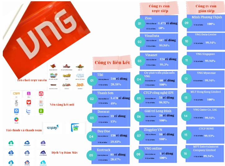- Đây là cổ đông lớn nhất, nắm giữ 49% cổ phần của VNG. VNG Ltd. là một công ty con của VNG Corporation, được thành lập để quản lý và phát triển các hoạt động quốc tế của tập đoàn.